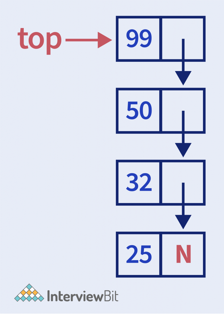 In linked list incorporation of a stack, each new element is put in as a ‘top’ element, which indicates each newly incorporated element is pointed by ‘top’. Whenever we wish to delete an element from the stack, just remove the node which is pointed by ‘top’ by moving ‘top’ to its earlier node in the list. The next field of the first element has to be NULL always.