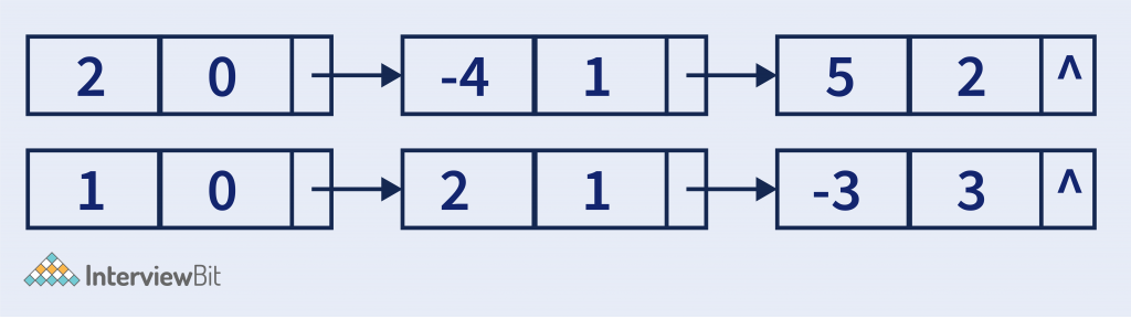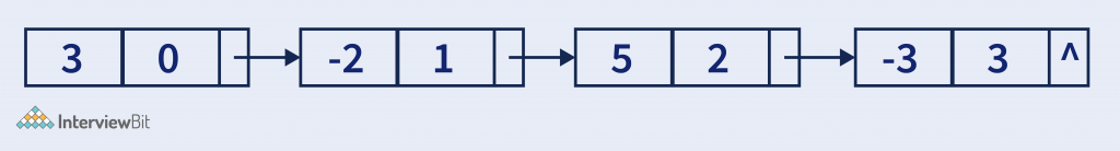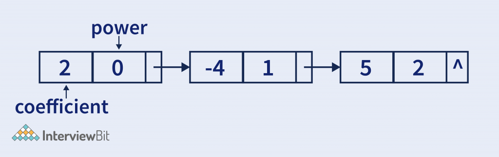 We can make use of a linked list to portray a polynomial. In the linked list, every node contains two data fields, namely coefficient, and power. Thus, every node denotes a term of a polynomial. For instance, we can depict the polynomial with a linked list: