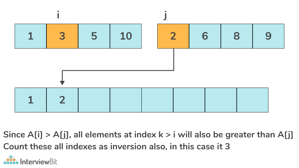 - To count the number of inversions, we will use a two pointers approach. Let us consider two pointers i and j, one pointing to the left half and the other pointing towards the right half.