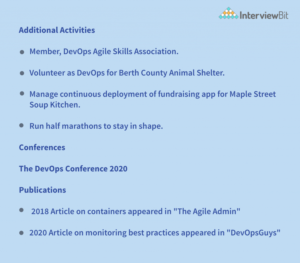 Add variety to your DevOps CV. Companies are looking for someone who will not only be skilled engineers but will also fit into their company culture. These extra parts can demonstrate to the recruiter what you’re passionate about and how you’re not only a strong skill match but also a solid culture match.