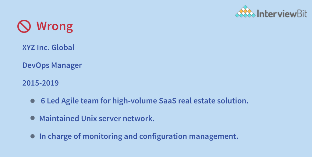 The work experience part is perhaps the most crucial step in demonstrating to the recruiter that you have the necessary qualifications for the position. This is where you demonstrate your DevOps experience, beginning with your most recent role and working backward.