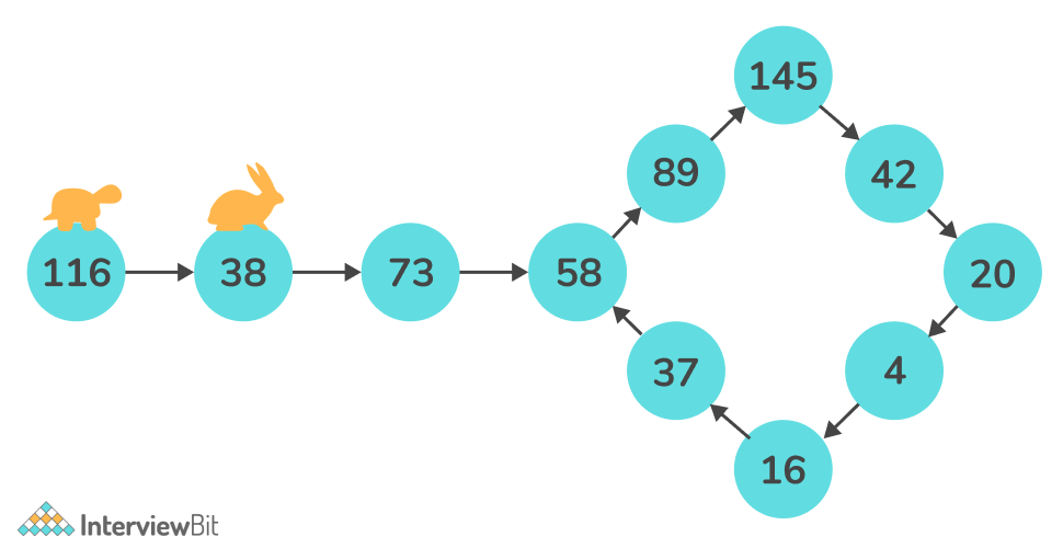 If an integer is not a Happy number, after certain steps it gets into the cycle. Now, this cycle can be thought of as a linked list and then our task would be to simply detect if a cycle exists in a linked list.
