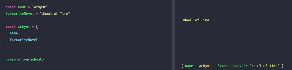 According to ES6/ES2015 syntax, if you want to define an object whose keys have the same name as the variables passed in as properties, you can use the shorthand and simply pass the key name. The object shorthand allows you to save time and space by allowing you to use this shorthand, making the code more idiomatic and concise: