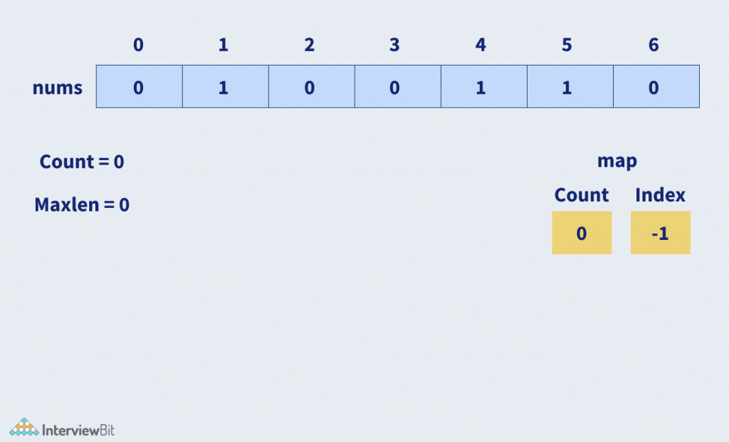 The idea is to use a hashmap to store the count of 0’s and 1’s. At any moment, when the count of 0s and 1s are the same, maximize the length of the subarray.