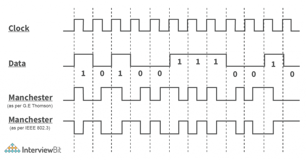 - There are many encoding schemes in which the data is encoded. Like – Manchester Encoding (As per G.E. Thomson and also IEEE 802.3 Encoding Scheme), Differential Manchester Encoding Scheme. Etc