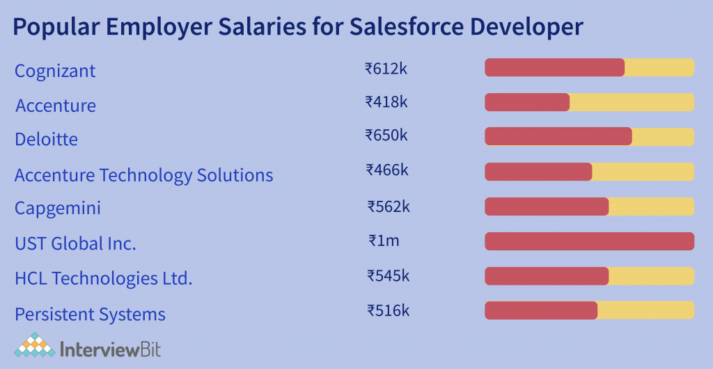 A larger corporation or brand will have a larger client base. As a result, larger businesses will develop their own salesforce app or software. In such circumstances, they are prepared to offer the greatest feasible compensation. The top organizations with the most replies for the job title Salesforce Developer are Cognizant, Accenture, and Deloitte. The highest reported wages are at Infosys Limited, with an average compensation of $749,238. Deloitte and Accenture Technology Solutions are two more firms that pay well for this position, with salaries of roughly 700,000 and 610,419, respectively. Capgemini pays the least, with a salary of approximately 455,904. Tata Consultancy Services Limited and Accenture are likewise on the low end of the range, with payments of 500,000 and 558,500, respectively.