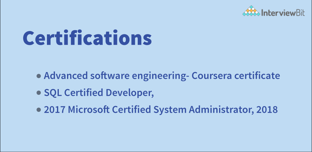 Certifications and awards, including online qualifications, instantly demonstrate a certain degree of technical abilities and knowledge, especially when they are provided by a well-known organization. If you don’t have one, you can list any achievements related to programming competitions and technical exams you’ve taken. If each of you has many certificates and accolades, consider separating them into separate categories.