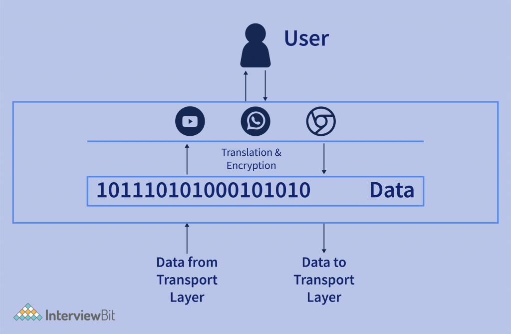 - In the above figure, the data that came from the end-user application is being converted to binary data for the next layer for further processing. And on another side, the data that came from the presentation layer is converted into user-readable application data.