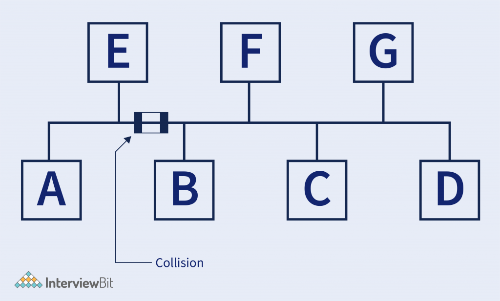 - In the below figure, Host B is sending data to Host A, and at the same time, Host E is also sending some data to Host C. So there is a collision. In the end, it is the electrical pulses that travel on the medium, and that will collide the whole data.