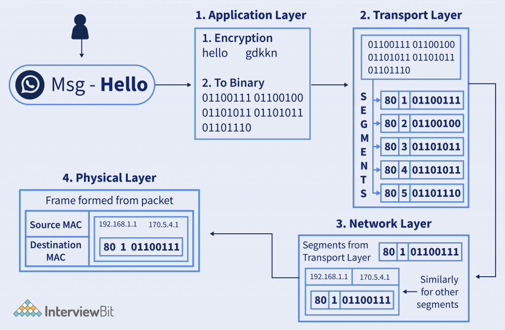 - Suppose users send messages on WhatsApp – “Hello”. Then on the application layer, it is encrypted according to the algorithm. And them the ASCII or UNICODE text is converted to binary data and sent to the next layer.